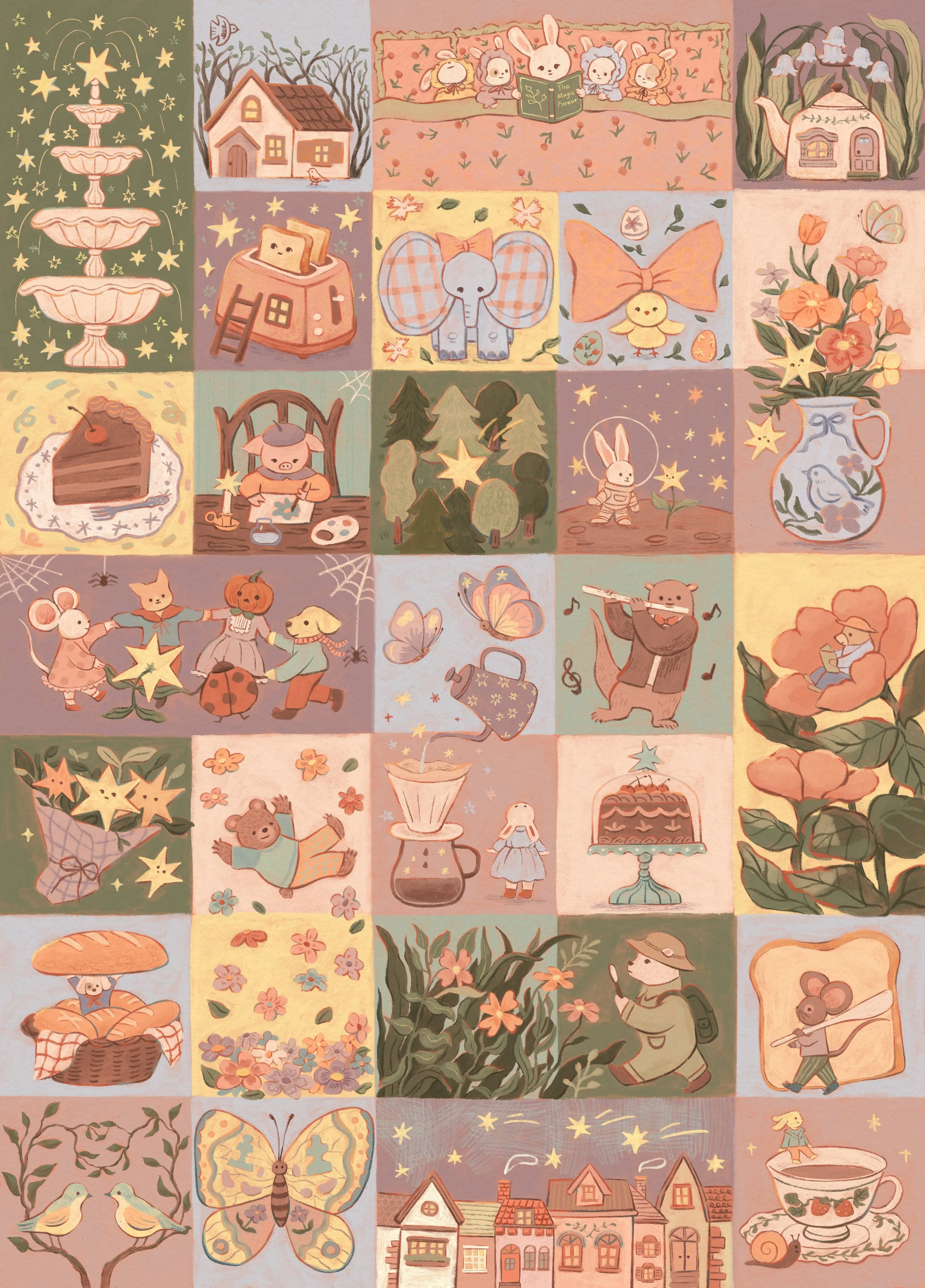 A colorful illustration collage featuring whimsical scenes and objects including a fountain, house, animals, flowers, animals reading and playing instruments, a cake, tea, and various flowers and plants.